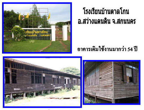ด้วยอาคารเรียนประจำโรงเรียนบ้านตาลโกน ตำบลตาลโกน อำเภอสว่างแดนดิน จังหวัดสกลนคร ซึ่งใช้เป็นสถานที่เรียนของนักเรียนมาร่วม 54 ปี ได้ชำรุดทรุดโทรมมากยากต่อการที่จะบูรณะซ่อมแซม เพราะเป็นอาคารไม้