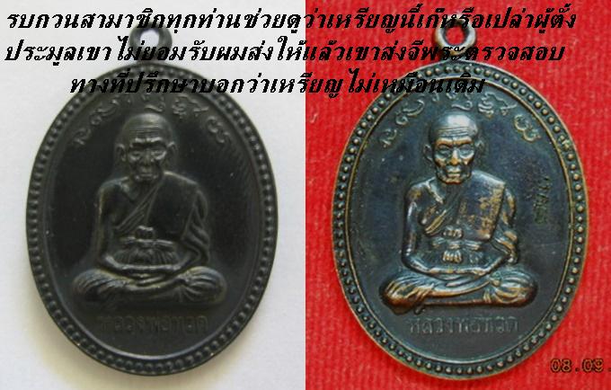 เหรียญนี้ผมประมูลมาในเว๊ปนี้จำได้ปี49เก็บไว้นาน3เดือนครบสี่ปีตรวจสอบทีหลังว่ามันเก๊ได้ส่งเมล์ถึงผู้ตั้งประมูลผู้ตั้งประมูลตอบกลับมาว่ารับประกันตลอดชีพส่งไปให้วันที่6ก.ย53ได้รับ7ก.ย53ทางผู้ตั้งประมูลไม่ยอมรับส่งต่อให้ทางจีพระตรวจสอบทางที่ปรึกษาได้โทรมาหาผมว่าเหรียญไม่เหมือนเดิมผมก็ตอบไปว่าตั้3ปีกว่าแล้วผมไม่ได้เลี่ยมเหรียญมันก็สึกตามสภาพแล้วผมถามว่ามันดูจากรูปแล้วมันเก๊หรือเปล่าไม่ตอบให้ผมไปหาหลักฐานมาว่าเป้นเหรียญเป็นเหรียญเดียวกันหรือเปล่าเงินแค่3000บาทผมจะมากุเรื่องเพื่อจะมาเอาเงิน3000บาทผมคงไม่ทำหรอกครับมันเสียชื่อผมลงรูปลองดูครับถ้าผู้ตั้งประมูลลงรูปตั้งประมูลแล้วเหรียญมันไม่แท้แต่กลับบอกว่าเหรียญไม่เหมือนกันผมก็ไม่รุ้ว่าจะทาอย่างไร