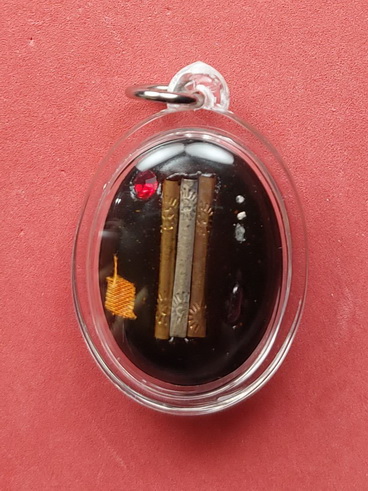 ล็อกเก็ตฉากทอง พิมพ์กลาง รุ่นโชคลาภมหาเศรษฐี ปี 2546 หลวงปู่หงษ์ วัดเพชรบุรี ปี 2546 ด้านหลังฝังตะกรุด 3 กษัตริย์ พลอย จีวร และ เกศาหลวงปู่หงษ์
