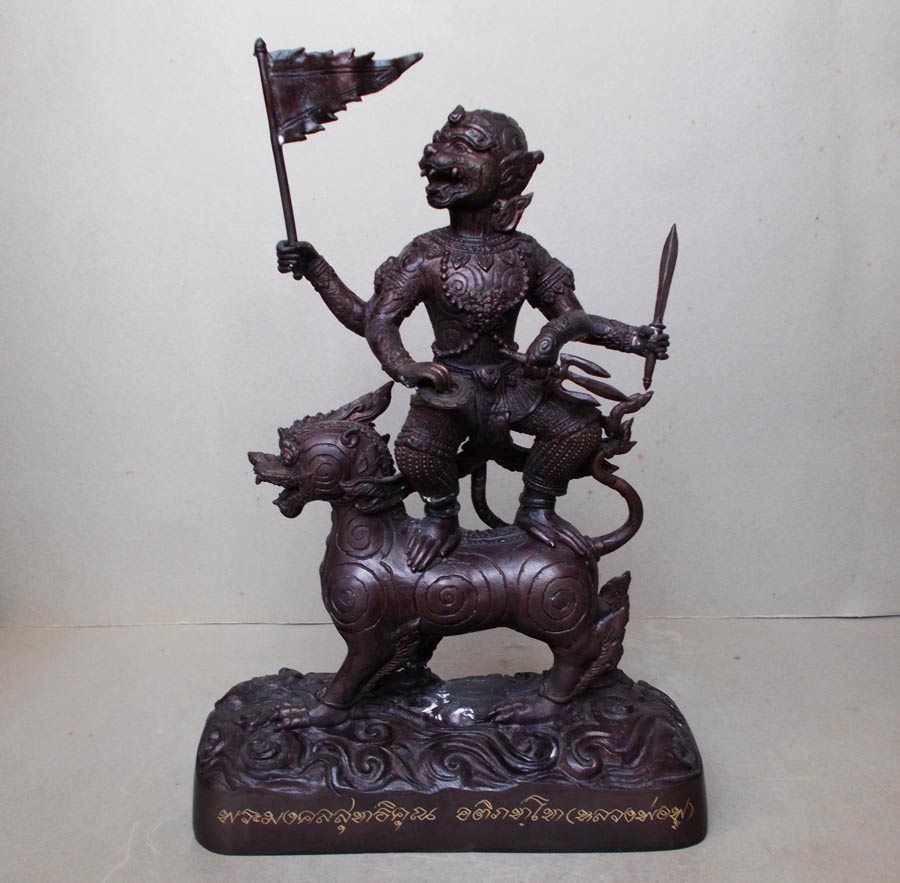 ขอแบ่งปัน รูปบูชาพญาหนุมาน 4 กร ประทับยืนบนพญาราชสีห์ เชิญธงออกรบ หลวงพ่อฟู วัดบางสมัคร จ.ฉะเชิงเทรา ออกปี ๕๓ เนื้อโลหะรมดำมันปู หน้ากว้่าง ๙ นิ้ว สูงรวมประมาณ ๑๔ นิ้ว จำนวน ๑ องค์ ครับ