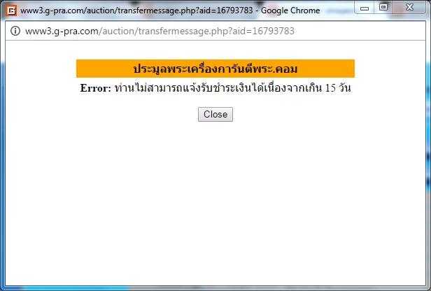 | หัวข้อกระทู้ : แจ้งการรับชำระเงินของผู้ชนะประมูลไปยังสถาบันการันตีพระไม่ได้ครับ |