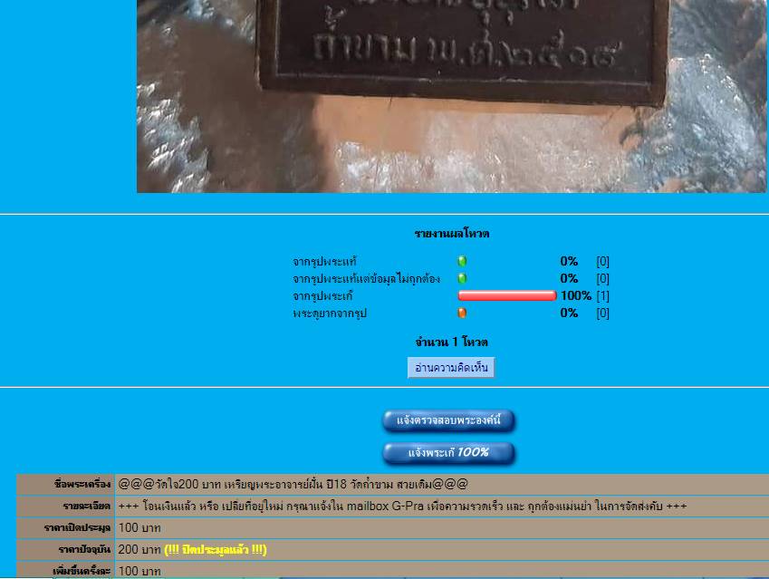 ผมลงประมูลพระ เหรียญอาจารย์ฝั้น ปิดประมูลไปตั้งแต่วันที่ 6เม.ย 62 ยอดประมูล 200 บาท แล้วคนที่ชนะประมูลไปในราคา200บาท ให้ฟิตแบคลบ ผม ทั่งๆที่ไม่มีการติดต่อกันเลยนะคับเงียบหายไปเลย และไม่ได้ซื้อขายกันเลยนะคับเพราะว่าผมเห็นมีคนโหวตเก้ ผมก็เลยไม่ได้ติดต่อไป แล้วอยู่ๆวันที่25 เม.ย62 คนที่ชนะประมูล ก็มาให้ฟิตแบค ลบ ผม ผมว่ามันไม่เป็นธรรมคับ รบกวนช่วยพิจารณาด้วยคับ ยอดชนะประมูล 200 บาท คับ ปิดประมูลไปตั้งแต่วันที่ 6เม.ย62 ขอบคุณมากคับ |