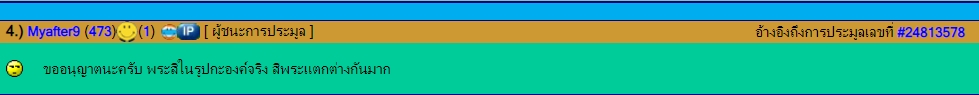 เนื่องจากผู้ชนะให้ผมส่งพระที่ประมูลออกบัตรรับรอง แต่เมื่อผลออกแล้วผู้ชนะประมูลขอคืนตามกฏ โดนบอกผิวต่างจากรูป(ผมก็ไม่ทราบว่าดูยังไงว่าต่าง เพราะส่วนตัวผมว่าผิวตรงตามรูป) ซึ่งผิวพระเหรียญถ้าหากมองในที่ไม่มีแสง ยังไงก็ไม่เห็นกระแสของผิวเหรียญ และอีกอย่างขึ้นกับการตั้งค่าสีของแต่ละอุปกรณ์ จึงมีกฏการรับประกันความพอใจ3วันเอาไว้ใช้ในเหตุการณ์ดังกล่าว แต่รายการนี้เมื่อผู้ชนะขอคืนผมได้รับคืนตามกฏ เมื่อผมได้รับพระก็โอนเงินคืนให้ทันทีหลังรับพระ ซึ่งเป็นไปตามกฏระเบียบของเวปทุกอย่าง แต่เมื่อผู้ชนะประมูลได้รับเงินคืนแล้ว มาให้ FEEDBACK เฉยๆ ซึ่งสื่อไปทางลบมากกว่าบวก ทั้งที่ได้ปฏิบัติตามกฏทุกอย่าง