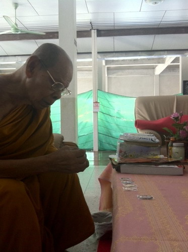 รูปที่2. เป็นรูปขณะที่หลวปู่กำลังตรวจดูเหรียญเสมาแต่ก็มีคำชมจากหลวงปู่มาว่าเหรียญเสมาเนื้อเงินซาตินสวยถูกใจหลวงปู่มาก