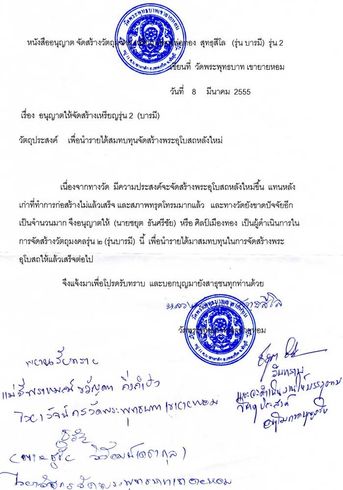 และขออนุญาตินำหนังสืออนุญาตจัดสร้างเหรียญรุ่น 2 รุ่น บารมี หลวงพ่อทอง มาให้ชมกันเพื่อความกระจ่างและหายสงสัย ก็แล้วแต่จะพิจารณา ร่วมบุญกันครับ