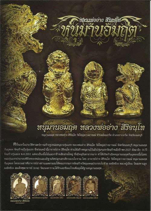 หนุมานอมฤต ก้นอุดผง จัดสร้างเป็นรุ่นแรก ซึ่งก่อนหน้านี้ อาจารย์อ่าง สิริจนฺโท ท่านได้สร้างหนุมานไว้แล้ว2รุ่นด้วยกัน แต่จะเป็นเนื้อไม้เสียส่วนใหญ่ ซึ่งปัจจุบันหายากมาก ทำให้เกิดกำเนิดหนุมานอมฤตก้นอุดผงเนื้อโลหะหล่อรุ่นแรกประกอบพิธีเททองหล่อและอธิฐานจิตปลุกเสกเดียวแบบโบราณ โดย อาจารย์อ่าง สิริจนฺโท วัดใหญ่สว่างอารมณ์