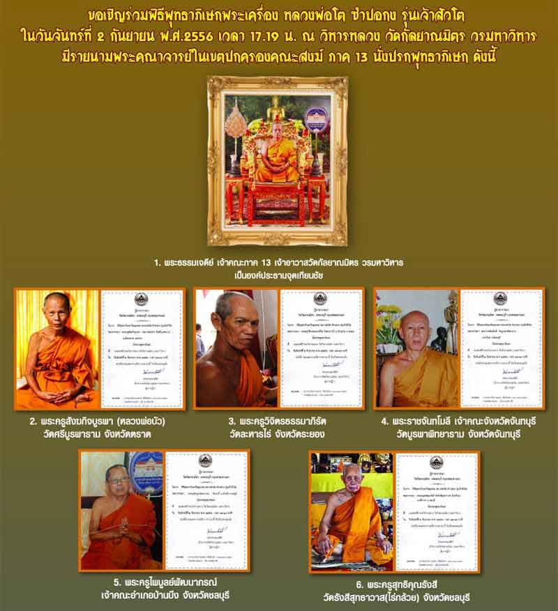โดยจะมีพิธีพุทธาภิเษกพระเครื่อง หลวงพ่อโต ซำปอกง รุ่นเจ้าสัวโต ในวันจันทร์ที่ 2 กันยายน พ.ศ.2556 เวลา 17.19 น. ณ วิหารหลวง วัดกัลยาณมิตร วรมหาวิหาร มีรายนามพระคณาจารย์ในเขตปกครองคณะสงฆ์ ภาค 13 นั่งปรกพุทธาภิเษก ดังนี้