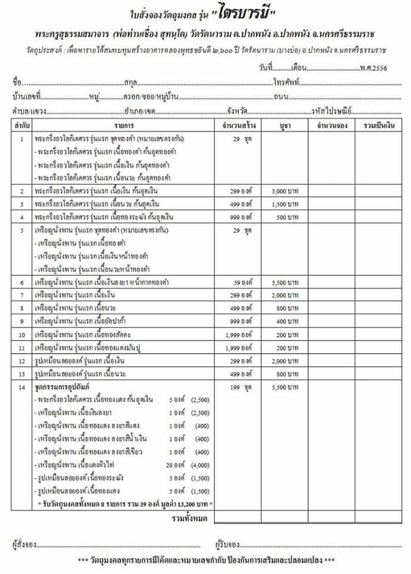 รายละเอียดทั้งหมด รายการ จำนวนสร้างและราคาบูชา ตามไฟล์ใบจองครับ