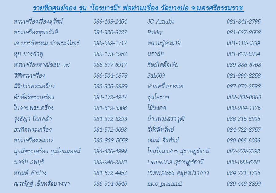 แจ้งรายชื่อศูนย์จองรุ่น "ไตรบารมี" พ่อท่านเชื่อง วัดบางบ่อครับ