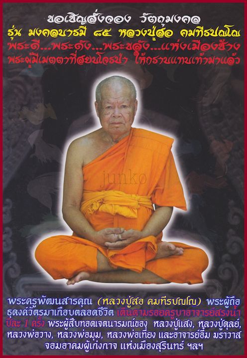 | หัวข้อกระทู้ : ฝากข่าว หลวงปู่สอ วัดบ้านขาม ต.บุแกรง อ.จอมพระ จ.สุรินทร์ รุ่น มงคลบารมี ๘๕ |