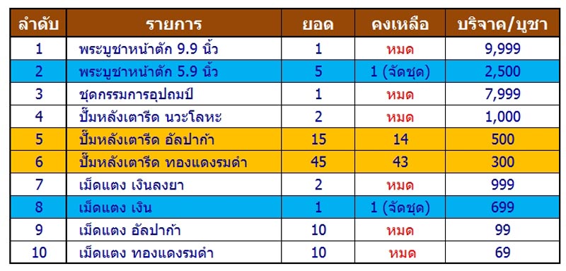 รายการที่ผมหนักใตคือพระบุชาครับ เพราะยอด 1 ศูนย์มีพระบูชามา 6 องค์ ขนาด 9.9 นิ้ว 1 องค์ ขนาด 5.9 นิ้ว 5 องค์ แต่จะด้วยเหตุผลกลใดก็แล้วแต่รายการพระบูชาหมดก่อนรายการอื่นๆ ซึ่งตอนนี้มีขนาด 5.9 นิ้ว เหลืออยู่แค่องค์เดียวเท่านั้น