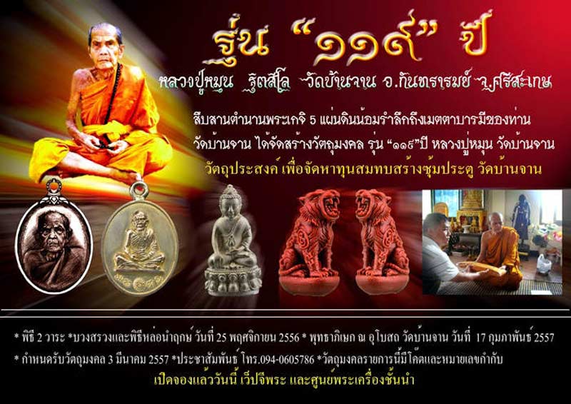 คืนนี้ (23/11/56) รอบค่ำครับ 21.00 น. มีพร้อมพระเครื่อง เปิดจองวัตถุมงคล รุ่น 119 ปี หลวงปู่หมุน วัดบ้านจาน อ.กันทรารมย์ จ.ศรีสะเกษ พระอริยสงฆ์ 5 แผ่นดิน ครับ