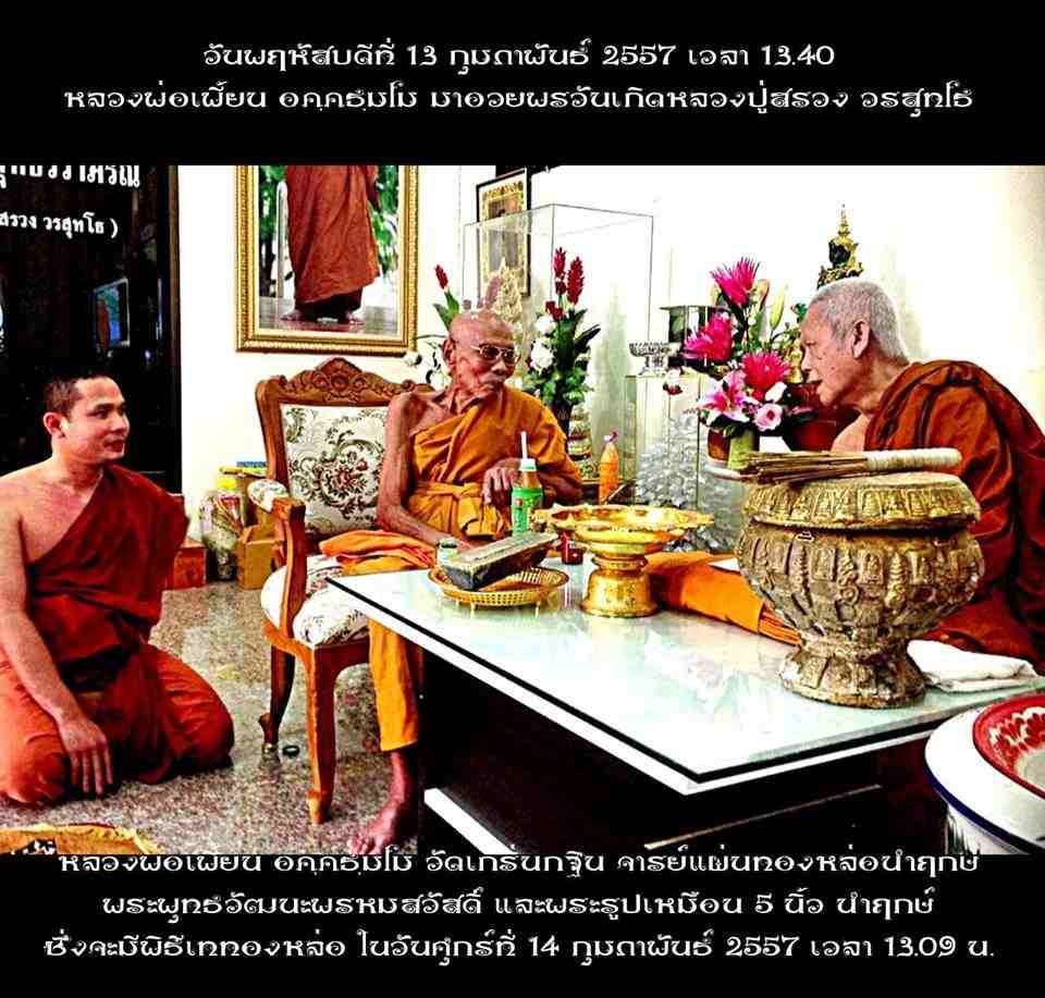 พรุ่งนี้วันแห่งความรักและวันสำคัญทางศาสนา วันที่ 14 กุมภาพันธ์ 2557 เป็นวันคล้ายวันเกิดของหลวงปู่สรวง วรสุทฺโธ วัดถ้ำพรหมสวัสดิ์ จะมีพิธีเททองหล่อพระพุทธวัฒนะพรหมสวัสดิ์และพระรูปเหมือนนำฤกษ์ ท่านใดอยู่ในละแวกใกล้เคียงเชิญนะครับ มาอวยพรวันเกิดหลวงปู่ปีนี้ท่านอายุครบ 81 ปี
