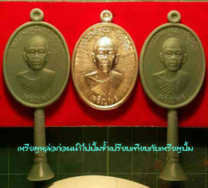 เหรียญพิมพ์นี้ทางผู้จัดสร้างคณะศิษย์จัดแจ้งนอก ใช้วีธีผลิตโดยการถอดแบบบล็อกเหรียญเจริญพรล่างปี 36 และนำไปหล่อออกมาเป็นเหรียญหล่อเจริญพรล่างที่มีความคมชัดสวยงามออกมาก่อน ซึ่งเหรียญหล่อนี้นับเป็นรุ่นแรกและครั้งแรกของรุ่นเจริญพร หลวงพ่อคูณที่มีการจัดสร้าง เท่านั้นยังไม่พอเพื่อเป็นการสร้างประวัติศาสตร์หน้าใหม่ทิ้งไว้ให้เป็นตำนานในวงการพระเครื่อง ให้เหรียญที่ออกมาสวยงามที่สุด ทางผู้จัดสร้างจึงนำเหรียญที่หล่อออกมาซึ่งมีความคมชัดสมบูรณ์ในรูปแบบเหรียญหล่ออยู่แล้ว นำไปปั้มซ้ำอีกครั้ง เหรียญที่ออกมาจะสวยงามเพียงใด ต้องติดตามเฝ้าชมกันต่อไปครับ  |