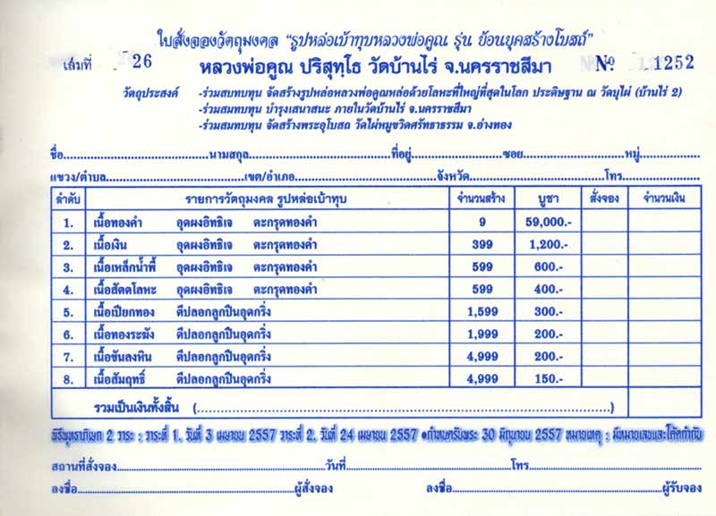 6 เนื้อทองระฆัง-ตีปลอกลูกปืนอุดกริ่ง สร้าง 1,999 องค์ 200 บาท ยอด 15 องค์