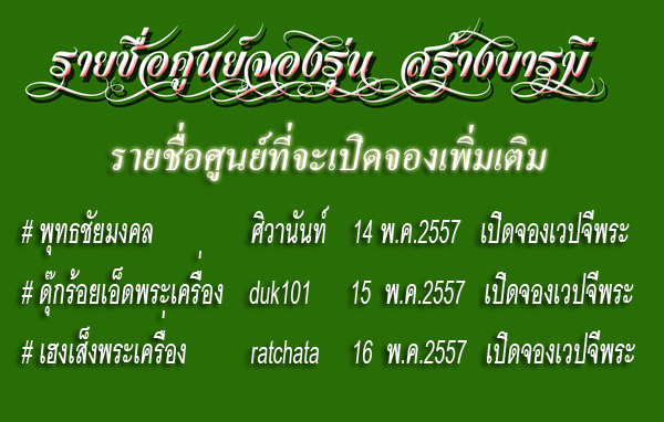 แจ้งรายชื่อศูนย์ ที่จะเปิดจอง ใน WEB-G เหรียญเสมา+หล่อเตารีดหลวงพ่อทวดพ่อท่านเขียว รุ่น สร้างบารมี....สำหรับท่านที่พลาดการจอง ของเนื้อที่ท่านต้องการ จะมีรายการที่หายาก มาแบ่งให้สมาชิก...ทั้งนี้ต้องขอขอบพระคุณทีมงาน ที่แบ่งยอดให้สมาชิกเราครับ ... ซึ่งบางศูนย์ เมื่อเปิดตัวก็หมดในทันทีเลยก็ว่าได้ครับ |