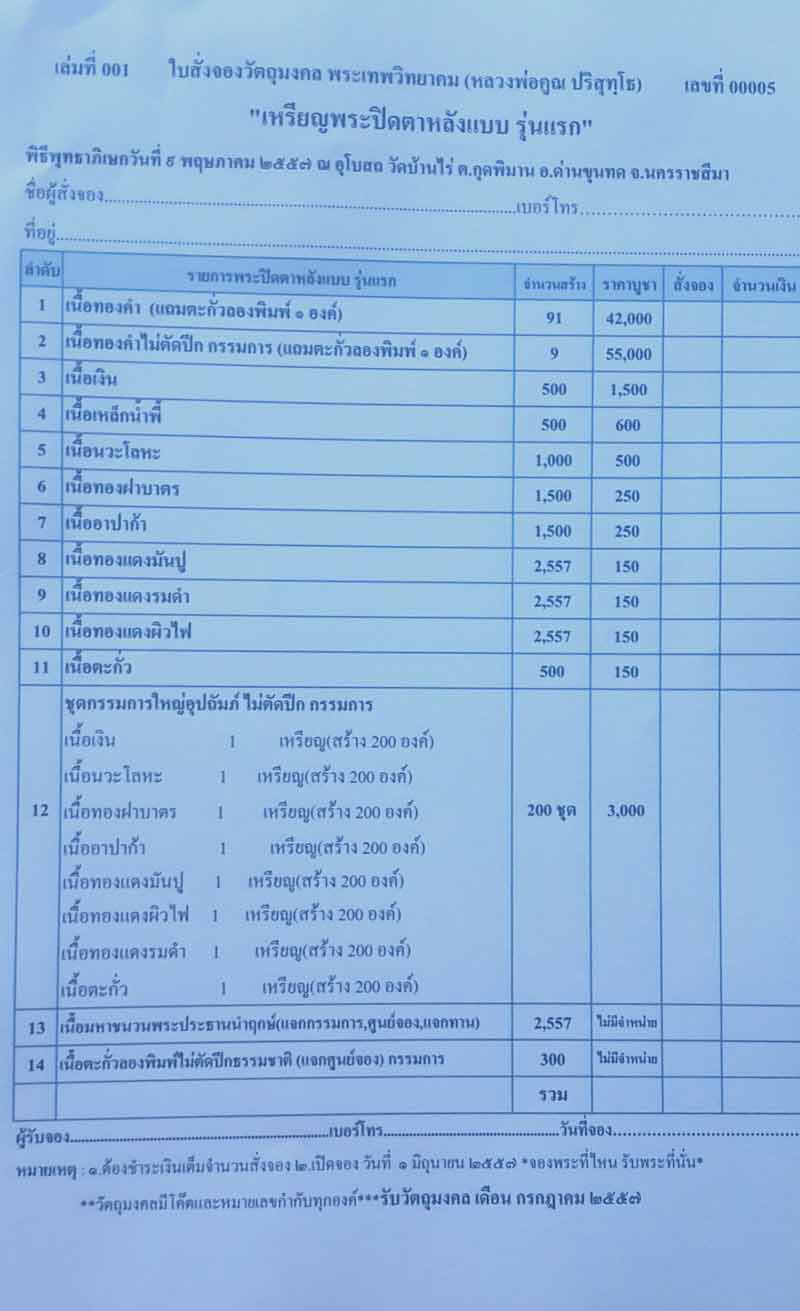 โปรโมชั่นพิเศษ สำหรับลูกค้าที่จองเนื้อทองคำ เหรียญปิดตาหลังแบบ รุ่นแรก หลวงพ่อคูณ ปริสุทโธ