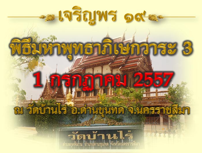 | หัวข้อกระทู้ : ข่่าวเจริญพร ๑๙***วันพรุ่งนี้ 1 กรกฏาคม 2557 เชิญร่วมพิธีพุทธาภิเษกวาระ 3 รุ่น เจริญพร๑๙ วัดบ้านไร่ |
