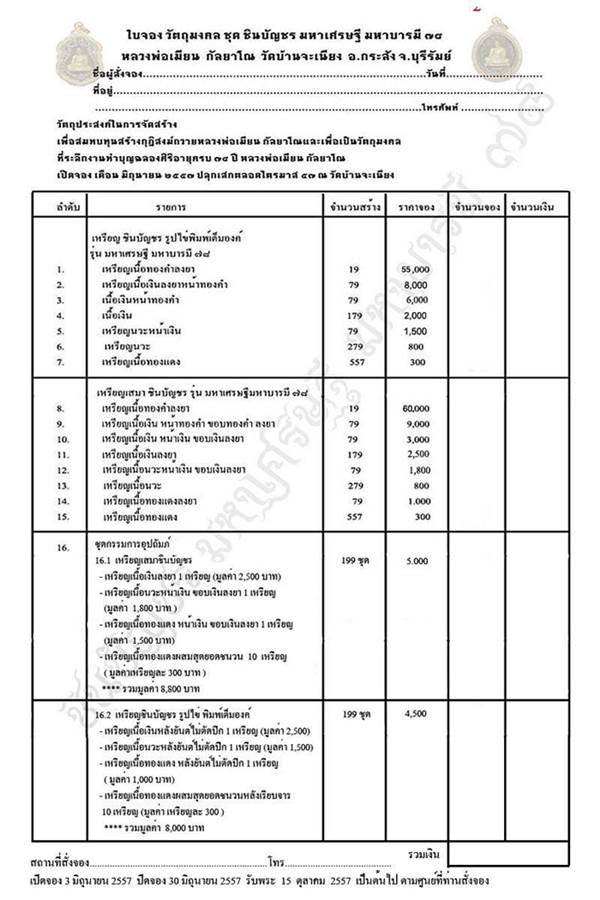 2. เพื่อเป็นที่ระลึกในวาระมงคลทำบุญฉลองสิริอายุหลวงพ่อครบ 78 ปีในวันที่ 19 พฤศจิกายน 2557นี้ |
