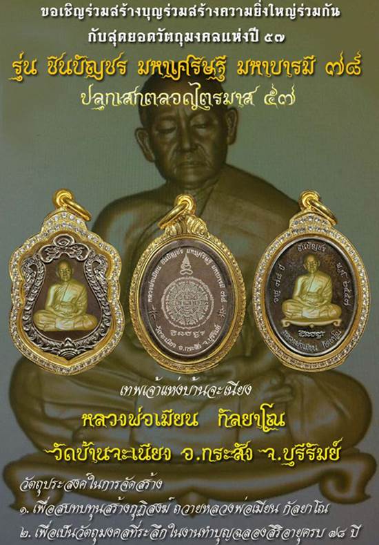 หลังจากเปิดตัวสุดยอดเหรียญแห่งปี 57หลวงพ่อเมียน กัลยาโณ " รุ่น ชินบัญชร มหาเศรษฐี มหาบารมี ๗๘ " ไปเมื่อวันก่อน..กระแสตอบรับเกินคาด พี่เพื่อนน้องเราและเหล่าลูกศิษย์ลูกศิษย์ลูกหาของหลวงพ่อโทรเข้ามาสอบถามรายละอียดต่างๆมากมาย..ต้องขอขอบคุณทุกๆกำลังใจ..อีกไม่นานเกินรอได้ร่วมสร้างบุญสร้างความยิ่งใหญ่ร่วมกันครับ