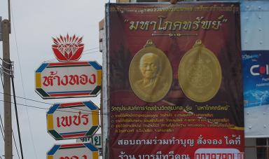 **ชายที่ปีนติดป้าย เป็นเพื่อนชาวโคราชบ้านอยู่ อ.ประทาย ประกอบอาชีพรับเลี่ยมพระที่บางเสาธง และเป็นศูนย์จองวัตถุมงคลหลวงพ่อคูณ ปริสุทโธ รุ่นมหาโภคทรัพย์ งานบุญสร้างโบสถ์ ชอบหัวใจของเพื่อน..ไม่มีรอ..งานบุญและเชื่อมั่นในตัวเพื่อนว่าจะทำงานให้ดีที่สุด ดูแลพระเหมือนอย่างที่เคยทำมาตลอดเวลาที่คบกัน 5-6 ปี ยอดสำหรับร้านเล็กๆ 4 แสนกว่า และยังไปได้เรื่อยๆ หมดมาเบิก หมดมาเบิก **