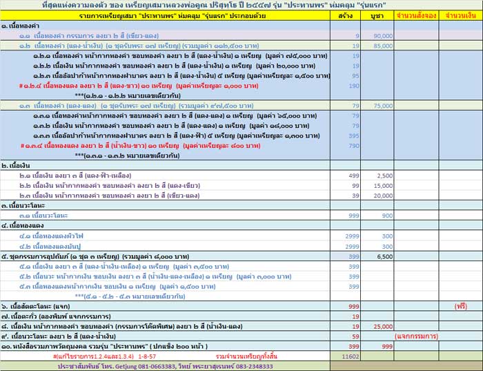 แก้ไขรายการชุดแถม ในชุดทองคำ การจัดสร้างเหรียญ เสมาประทานพร