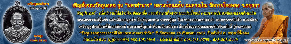 ขออนุญาต แจ้งกำหนดการพิธีอธิษฐานจิตปลุกเสกเดี่ยว เหรียญ"มหาอำนาจ" หลวงพ่อแฉล้ม วัดกระโดงทอง จ.อยุธยา ในวันอาทิตย์ที่ ๗ กันยายน พ.ศ.๒๕๕๗ เวลา ๑๓.๑๙ น. ทางวัดมีของที่ระลึกสำหรับทุกๆท่านที่เข้าร่วมพิธีครับ