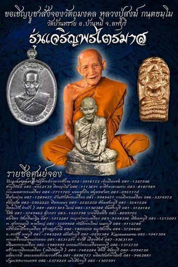 เรียนเชิญทุกท่าน พิธีพุทธาภิเษกใหญ่ วันที่ 11 ต.ค. 57 ณ.วัดบ้านทราย เนื่องด้วยทางวัดบ้านทราย จ.ลพบุรี จัดสร้างวัตุมงคล หลวงปู่สงฆ์ วัดบ้านทราย รุ่นเจริญพรไตรมาส -เหรียญเจริญพรไตรมาส -รูปหล่อไตรมาส -ปรกเจริญพรไตรมาส พร้อมทั้งได้รับความสนใจ และความนิยม เป็นอย่างมาก จนทำให้นักเลงพระเครื่อง ได้จับจองเป็นเจ้าของ ด้วยยอดจองตามศูนย์พระเครื่องชั้นนำ หมดอย่างรวดเร็วเพียงในไม่กี่ชั่วโมง ด้วยความเมตตาจากหลวงปู่ -หลวงปู่เมตตาปลุกเสกเดี่ยว 1ไตรมาส -พิธีพุทธาภิเษกใหญ่รวมเกจิ ในวันดังกล่าว อีกครั้ง เท่ากับว่ารุ่นนี้ ปลุกเสก กันแบบเต็มเหนี่ยว 2เด้ง เลยทีเดียว รุ่นนี้ถือว่า สุดยอดทั้งพุทธคุณ และความสวยงาม เป็นอย่างมาก จึงเรียนมาเพื่อทราบ พีทระยอง พระเครื่อง ปล.ถ้ามีการเปลี่ยนแปลงจะแจ้งให้ทราบอีกครั้ง |