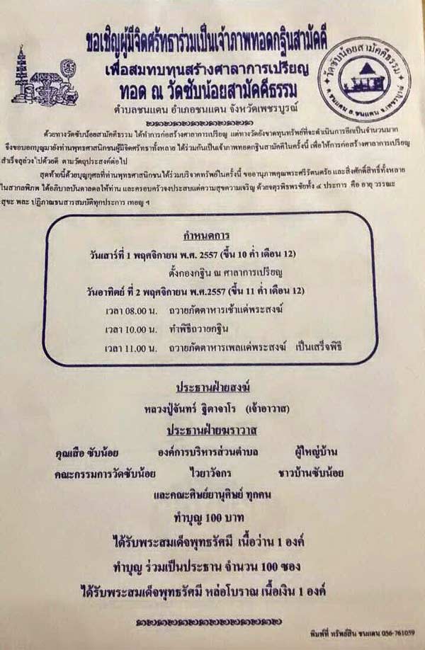 2. ทำบุญร่วมเป็นประธาน จำนวน 100 ซอง 10,000 บาท