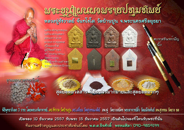 | หัวข้อกระทู้ : บอกกล่าวข่าวงานบุญ....วัดบ้านปูน อยุธยา หลวงตาชัชวาลย์ ขุนแผนผงพรายปทุมทิพย์ |