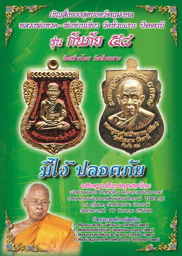 วันนี้ฤกษ์ดี ตรงกับวันที่ ๑๗ มีนาคม ๒๕๕๘ เป็นวันพุทธาภิเษก หลวงพ่อทวด พ่อท่านเขียว รุ่น กันภัย ๕๘ ณ.อุโบสถ วัดห้วยเงาะ ปัตตานี โดยมีพระสงฆ์ ๑๐๘ รูป เจริญพุทธมนต์ รวมทั้งพระเกจิที่เป็นที่นับถือของทางภาคใต้ เข้าร่วมอธิฐานจิตด้วยกันหลายรูป ที่สำคัญไม่บ่อยนักที่จะทำการพุทธาภิเษก ในอุโบสถวัดห้วยเงาะ เรียกว่า พิธีดี พิธีใหญ่ เข้มขลัง กับ วัตถุมงคล ** รุ่นกันภัย ๕๘ ** |