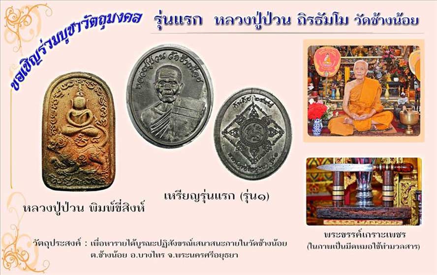 เมืองกรุงเก่า จังหวัดพระนครศรีอยุธยา ได้ชื่อว่าเป็นดินแดนแห่งธรรมที่มีพระเกจิอาจารย์ชื่อดังทั้งเก่าและใหม่จำนวนมาก สืบสานพุทธาคมจากรุ่น สู่รุ่น หลวงปู่ป่วน ถิรธัมโม เจ้าอาวาสวัดอนุกุลชราราราม(วัดช้างน้อย) อ.บางไทร จ.พระนครศรีอยุธยา ท่านเป็นพระเกจิอาจารย์รูปหนึ่งที่ได้รับความเลื่อมใสศรัทธามาอย่างยาวนานของชุมชนบางไทรเนื่องจากศีลาจารวัตรที่งดงามบริบูรณ์ประกอบกับความเมตตากรุณาอันเป็นที่หนึ่งของบ้านบางไทร ใครต่อใครมาขออะไรก็แล้วแต่...ล้วนไม่มีใครที่ไม่ได้รับความเมตตากลับไป เมื่อกลับไปแล้วประสบความสำเร็จ....จะกลับมาเป็นศิษย์ก้นกุฏิกันทุกราย