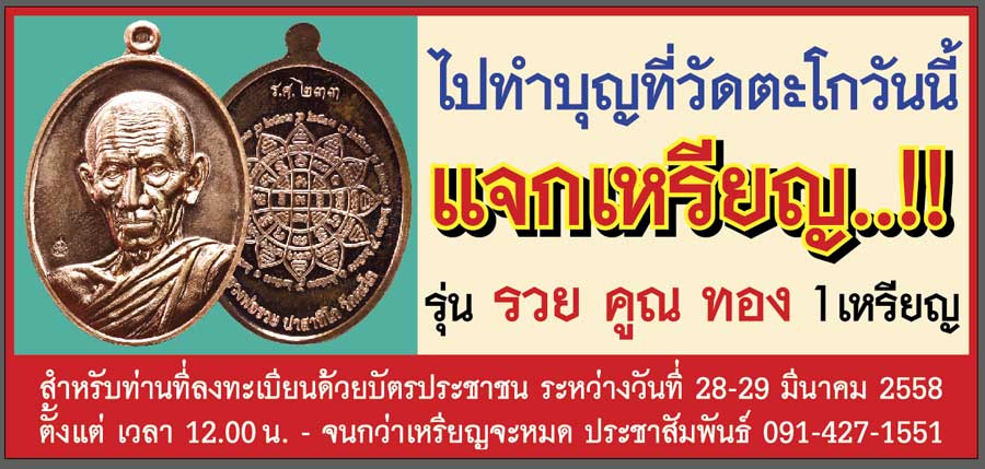 โดยในวันเสาร์-อาทิตย์ที่ 28-29 มีนาคม 58 นี้ ทางท่านอาจารย์สมชาย อนาลโย ได้ทำการแจกเหรียญทองแดงแจกทาน รวย คูณ ทอง ให้แก่ญาติโยม สาธุชน ที่เข้ามาที่วัดตะโก โดยไม่มีค่าใช้จ่ายใดๆ