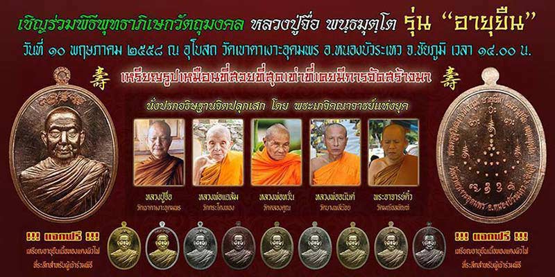 เรียนเชิญพี่ๆทุกๆท่าน เข้าร่วมพิธีพุทธาภิเษก วัตถุมงคล หลวงปู่จื่อ พนฺธมุตฺโต รุ่น "อายุยืน" ณ อุโบสถ วัดเขาตาเงาะอุดมพร อ.หนองบัวระเหว จ.ชัยภูมิ ในวันอาทิตย์ที่ 10 พฤษภาคม 2558 เวลา 14.00 น. เป็นต้นไป
