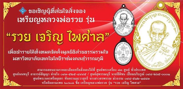 โดยในวันที่ 11 กันยายน 2558 ผู้ช่วยศาสตราจารย์ไพศาล บุรินทร์วัฒนา อธิการบดีมหาวิทยาลัยเทคโนโลยีราชมงคลสุวรรณภูมิ ได้เข้าพบและชี้แจงถึงวัตถุประสงค์การจัดสร้างเหรียญฯ ให้คณะกรรมการของวัดตะโกได้รับทราบและอนุมัติเห็นชอบเป็นเบื้องต้นแล้วจึงกราบนมัสการพระเดชพระคุณท่านพระครูสุนทรธรรมนิวิฐ(หลวงพ่อรวย ปาสาทิโก) วัดตะโก จ.พระนครศรีอยุธยา ขออนุญาตจัดสร้างวัตถุมงคล เหรียญหลวงพ่อรวย ปาสาทิโก รุ่น รวย เจริญ ไพศาล เพื่อให้ชาวมหาวิทยาลัยเทคโนโลยีราชมงคลสุวรรณภูมิ รวมทั้งสาธุชน และศิษยานุศิษย์ทั่วไป ของหลวงพ่อรวย ปาสาทิโก ได้ร่วมบริจาคเงินเพื่อนำรายได้ตั้งเป็นมูลนิธิสวนธรรมรวมใจ มหาวิทยาลัยเทคโนโลยีราชมงคลสุวรรณภูมิ |