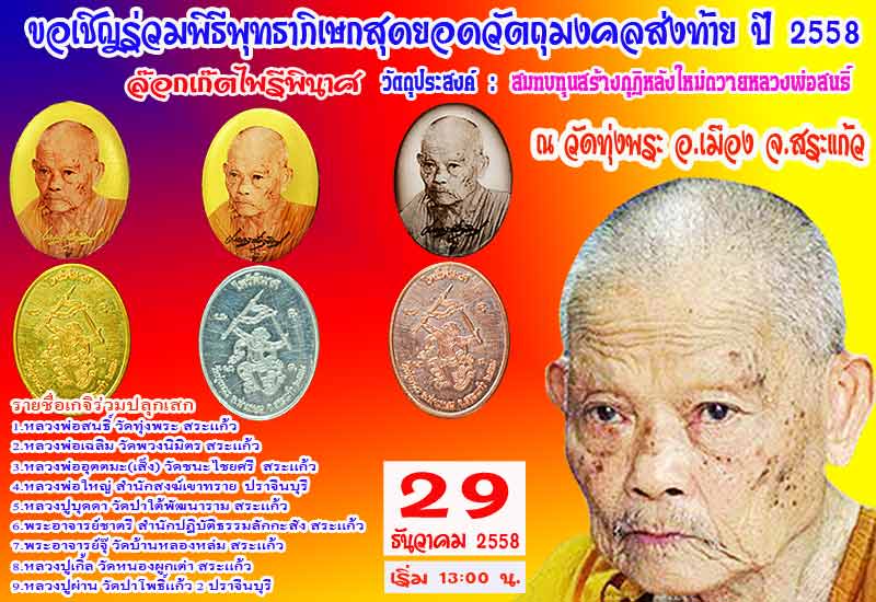 ขออนุญาตินำภาพบางส่วนมาให้ชมกันนะครับ เป็นภาพพิธีพุทธาภิเษกล๊อกเก๊ตไพรีพินาศ หลวงพ่อสนธิ์ วัดทุ่งพระ สระแก้ว เพื่อสมทบทุนสร้างกุฏิให้หลวงพ่อสนธิ์