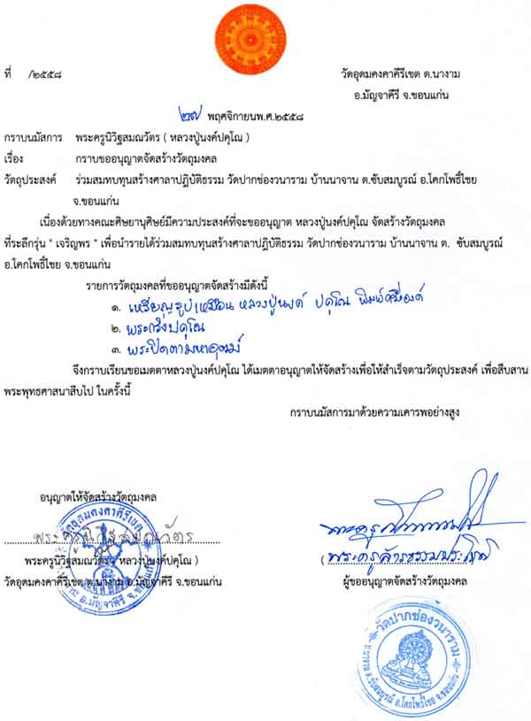 ด้วยเหตุนี้เมื่อวันที่ 27 พ.ย 2558 ทางวัดปากช่องวนาราม จึงได้ทำหนังสือขออนุญาตจัดสร้างวัตถุมงคลพระครูนิวัฐสมณวัตร หรือหลวงปู่นงค์ ปคุโณ วัดอุดมคงคาคีรีเขต ต.นางาม อ.มัญจาคีรี จ.ขอนแก่น เพื่อนำรายได้สมทบทุนสร้างศาลาการเปรียญให้แล้วเสร็จตามเจตนารมณ์ และหลวงปู่ท่านก็อนุญาตตามที่ขอมา ตามหนังสืออนุญาตลงวันที่ 27 พ.ย. 2558 แล้วนั้น อีกทั้งหลวงปู่ท่านได้เมตตาให้ชื่อรุ่น เจริญพร อีกด้วยครับ ..จากวันนั้นเป็นต้นมาทางคณะศิษย์และทางวัดปากช่องวนารามเอง ก็ได้รวบรวมปัจจัยเพื่อให้ทางโรงงานปั้มพระในกรุงเทพ ย่านฝั่งธนได้ทำบล๊อคขึ้น กว่าจะแล้วเสร็จก็เกือบ 3 เดือน เพราะช่างต้องใช้เวลาแกะบล๊อค และติดงานอื่นๆอีกมากมายครับ ทางวัดปากช่องวนารามจึงขอชี้แจงเรียนให้ทราบดังต่อไปนี้ครับ