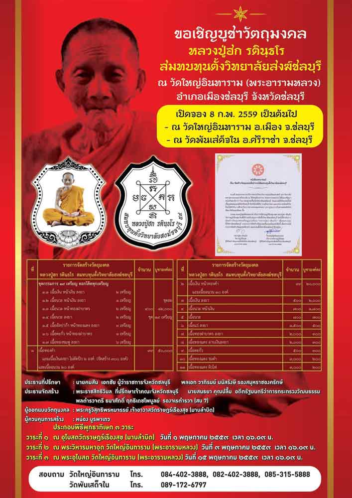 เหรียญอาร์มหลวงปู่ฮก รตินธโร จัดสร้างโดยวัดใหญ่อินทาราม (พระอารามหลวง) จ.ชลบุรี รายได้สมทบทุนตั้งวิทยาลัยสงฆ์ชลบุรี