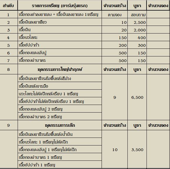 โอกาสปีนี้ฤกษ์ดีท่านได้สร้างเปิดจองเหรียญ อาร์มรุ่นแรก ท่านจะปลุกเสก 9 วัน และเสกพิธีรวมคณาจารย์หลายรูปที่วัดอีก 1 วัน เป็นเสร็จพิธี เชิญทุกท่านได้เจอร่วมทำบุญกันแล้ว |