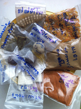 11.ผงพระเก่า, ผง108 12. ผงน้องแมว 13. ผงว่านไฟ 14. ผงขี้เหล็กไหล , ดินมงคลพระธาตุ 15. ผงใบลานตัวขอมเก่า 16. ผงมะรุม