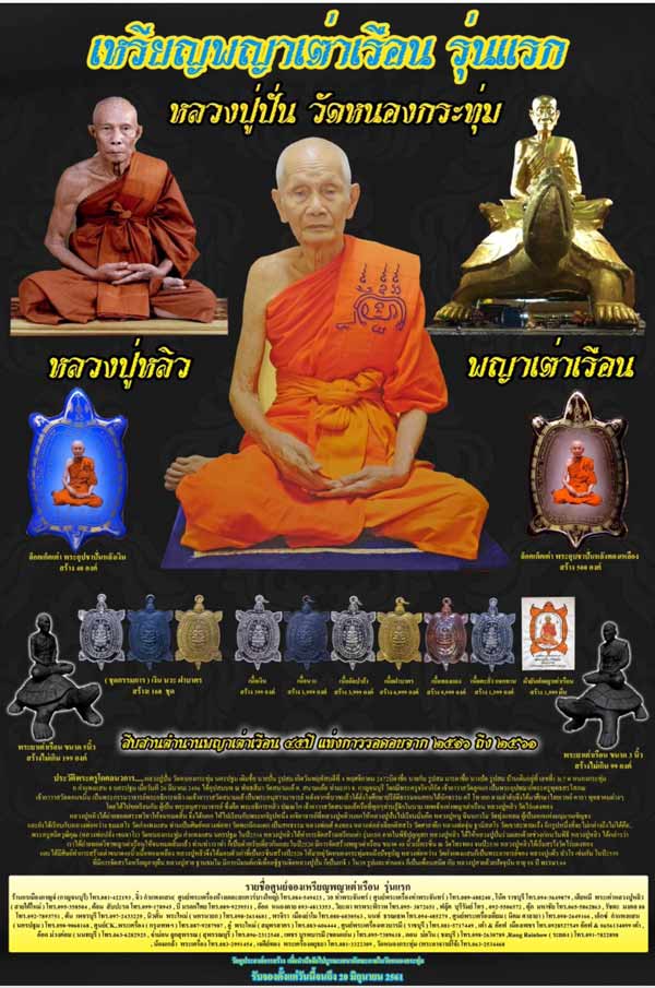 หลวงปู่ปั่น กวิสฺสโร วัดหนองกระทุ่ม อ.กำแพงแสน จ.นครปฐม หนึ่งในพระเกจิ๕รูปที่ยังมีชีวิตและร่วมปลุกเหรียญพญาเต่าเรือนหลวงปู่หลิวปี๒๕๑๖ซึ่งปัจจุบันถือว่าเป็นเหรียญยอดนิยมไปแล้ว เมตตามหานิยม ค้าขายร่ำรวย แคล้วคลาดปลอดภัย หลวงปู่ปันเป็นทั้งลูกศิษย์และศิษย์น้องของหลวงปู่หลิวหลวงปู่หลิวมักจะไปไหนมาไหนโดยมีหลวงปู่ปั่นตามไปตลอดหลวงปู่หลิวรักและเมตตาหลวงปู่ปั่นมากๆหลวงปู่หลิวได้ถ่ายทอดวิชาอาคมให้หลวงปู่ปั่นจนหมดจนครั้งหนึ่งหลวงปู่หลิวเคยบอกกับหลวงปู่ปั่นว่าท่านทำเราทำก็เหมือนกัน วัดหนองกระทุ่มและวัดไร่แตงทองอยู่ห่างกัน ๔ กม. ปัจจุบันหลวงปู่ปั่นเป็นพระเกจิต้นๆของเมืองนครปฐมและอายุ๘๙ปีแล้ว ๔๕ปีแห่งการรอคอยจาก๒๕๑๖ถึง๒๕๖๑สืบสานตำนานพญาเต่าเรือนโดยหลวงปู่ปั่นปลุกเสกวาระที่๑วันที่ ๑๘ พฤษภาคม ๒๕๖๑ ที่วัดหนองกระทุ่มโดยตำราของหลวงปู่หลิวเต่าจะแช่น้ำมนต์เข้มขลังสุดๆและวาระที่๒จะมีขึ้นที่วัดไร่แตงทอง อ.กำแพงแสน จ.นครปฐม วันที่ ๒๑ มิถุนายน ๒๕๖๑ ท่านใดว่างๆเรียญเชิญนะครับในพิธีมีเหรียญแจกทานแจกด้วยครับ |