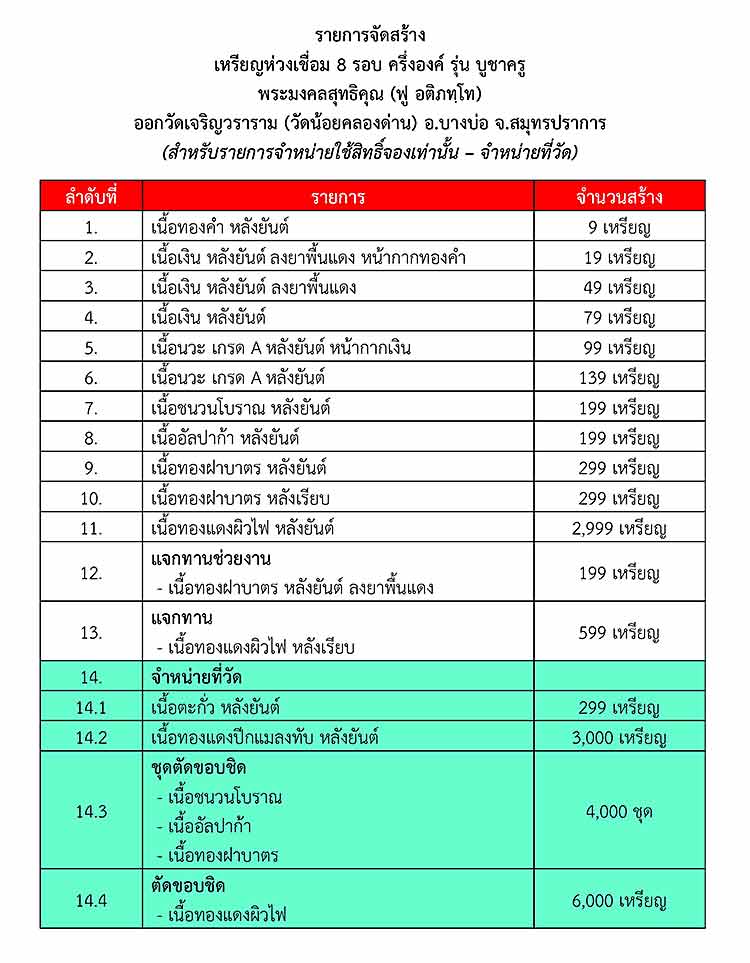 ในวาระ ๘ รอบ ๙๖ ปีหลวงปู่ฟู ทางกลุ่มสยามศิลป์ได้จัดสร้างเหรียญเจริญพรบน และ เหรียญห่วงเชื่อม เพื่อนำเงินรายได้จากการจัดสร้างไปทำห้องน้ำสำหรับปฏิบัติธรรม ณ วัดน้อยคลองด่าน จ.สมุทรปราการ