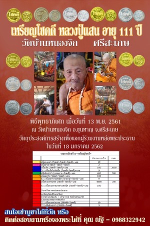 เหรียญโชคดีหลวงปู่แสน. พิธีพุทธาภิเษกเมื่อวันที่ 13 พฤศจิกายน 2561 ณ วัดบ้านหนองจิก ศรีสะเกษ โดยหลวงปู่แสนเป็นประธานในพิธี