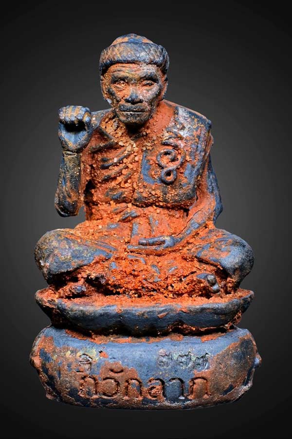 #มีคนมาขอให้หลวงปู่ สร้างรูปหล่อ รุ่นแรก ทั้งฝั่งลาว ฝั่งไทย หลายร้อยคนขอ หลวงปู่ก็บอกว่ายังทำให้ไม่ได้ เมื่อไหร่ที่ถึงเวลา หลวงพ่อสามองค์เกิด ค่อยทำ (พระสีสุก พระสีเงิน พระสีทอง ) เกิดพอดี หลวงปู่ อายุกาลล่วงเข้าวัย ๘๖ หลวงปู่ ว่า ถึงเวลาแล้ว นิมิตเห็นเทวดามาขอ หลวงปู่ ได้สร้างรูปหล่อท่านขึ้น ช่างปั้นก็ดีใจหาย ปั้นได้เหมือนหลวงปู่มากๆ ท่านกำหนดเอง นั่งเป็นแบบเอง ยกมือชูขึ้นกวักลาภใหญ่ นั่งอยู่บนถุงเงิน อุปมาให้มีสมบัติตักไม่พร่อง มีแมลงปอ สองตัว เป็นบริวาร (ประสบการณ์สูงมาก ) เกาะถุงเงินขนาบ ซ้าย ขวา หมายถึง อาหารการกินอุดมสมบูรณ์ตลอดปี ชักยันต์นะสารพัดนึกลงสังฆาฏิ ด้านหลังให้ รวย ตลอดชาติ ใต้ฐานเจาะก้น บรรจุ เกศา ผงจักรพรรดิ อุดปฐวีธาตุ ( หรือแก้วนาคราช ธาตุกายสิทธิ์ ที่หลวงปู่ได้มาตอนธุดงค์ ) บางองค์อุด เม็ดทองเอก ที่เหลือจากบรรจุพระผงแมลงปอแปดอรหันต์