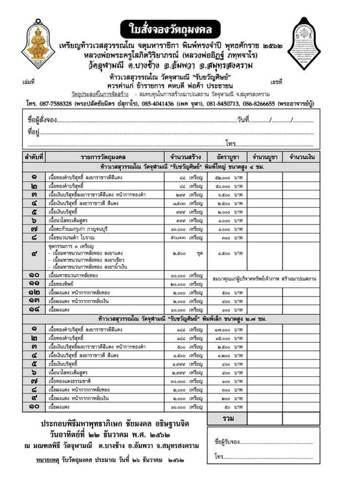 ชมรายละเอียดใบจอง เหรียญรุ่น รับขวัญศิษย์ วัดจุฬามณี