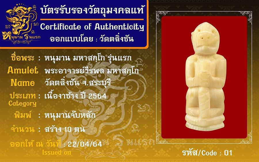 ขณะนี้ทางวัดได้กำลังดำเนินการออกบัตรให้กับผู้ที่สั่งจองหนุมานมหาสกฺโก ทุกท่านครับ |