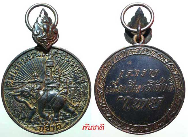 เหรียญสร้างจากเนื้อดีบุกด้านหน้าเหรียญเป็นภาพสมเด็จพระนเรศวรมหาราชทรงยุทธหัตถี ด้านล่างมีข้อความว่ากู้ชาติ ส่วนด้านหลังเหรียญมีข้อความว่าเรารบเพื่อเกียรติศักดิ์ไทย