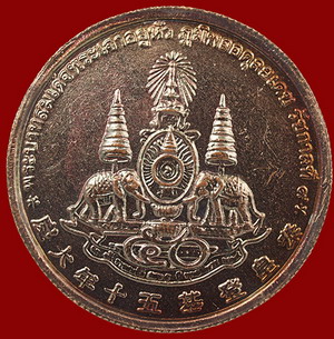ด้านหลัง เป็นตราสัญลักษณ์การจัดงานเฉลิมฉลองครองราชครบ 50 ปี ด้านบนมีภาษาไทยคำว่า พระบาทสมเด็จพระเจ้าอยู่หัว ภูมิพลอดุลยเดช รัชกาลที่ 9 ด้านล่างมีภาษาจีน 9 ตัว หมายถึง งานฉลองครอง 50 ปี