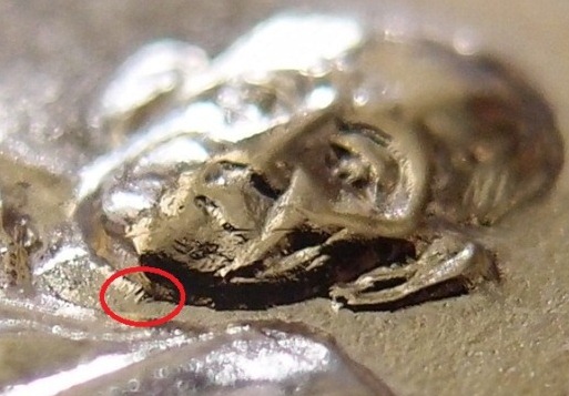 นอกจากขอบตัดที่เป็นเอกลักษณ์สำคัญที่ของเก๊ยังทำได้ไม่เหมือนแล้ว ขออนุญาติชีตำหนิอีกจุดหนึ่งซึ่งของเก๊ยังไม่มีรึเลียนแบบได้ไม่เหมือน ตำหนินี้อยู่ใต้คางของหลวงพ่อเยื้องมาทางขวามือเราเล็กน้อย เป็นเส้นนูนสามเส้น จุดนี้มีทั้งรุ่นหลังยันต์และหลังหนุมาน แม้พระจะถูกใช้จนหน้าสึกก็ยังสามารถเห็นได้เนื่องจากอยู่ในจุดที่ซ่อนสัมผัส หมั่นสังเกตุจุดนี้แล้วไม่จำเป็นต้องแกะเลี่ยมมาดูกรณีที่พระเลี่ยมไว้ครับ จากรูปในวงกลมสีแดงครับ |