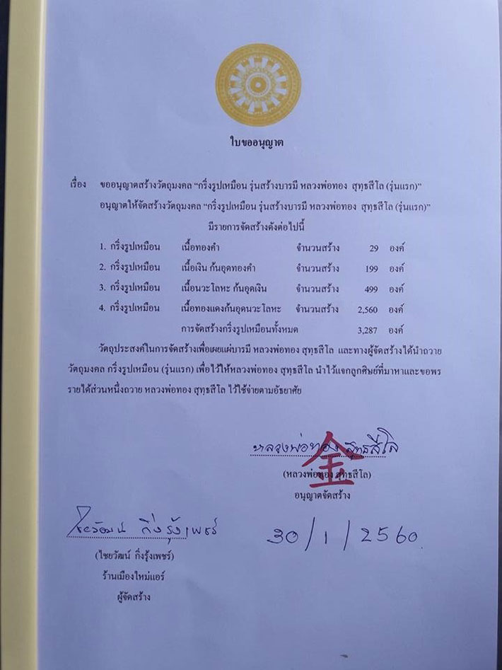 ผู้สร้าง คุณไชย์วัฒน์ กิ่งรุ้งเพชร์ ได้ถวายเงินสดเลยเมื่อ 9 กรกฏาคม 2560 ให้หลวงพ่อทอง ไว้ใช้จ่ายตามศัธยาศัย 100,000 บาท(หนึ่งแสนบาทถ้วน) ตามที่บอกหลวงพ่อไว้เลยครับ และผู้สร้างได้ถวายอีก 105,000 บาท(หนึ่งแสนห้าพันบาทถ้วน) ในงานกฐินวัดบ้านไร่ เพื่อสบทบทุนสร้างกุฏิสงฆ์วัดบ้านไร่ เมื่อ 1 พฤจิกายน 2560 ถวายในนาม หลวงพ่อทอง สุทฺธสีโล |